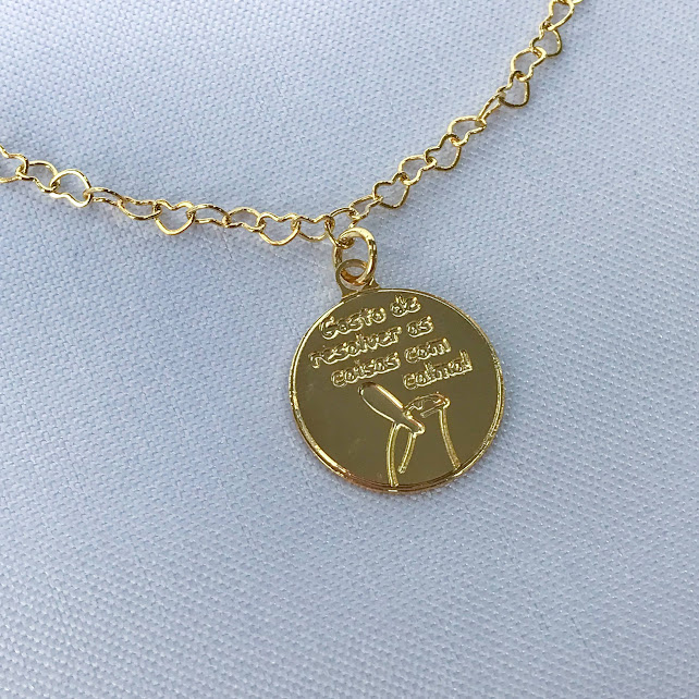 Pulseira elos corações entrelaçados de 17cm + extensor de 5cm + pingente em formato de medalha 1,5cm com personagem Flork com escrita “Gosto de resolver as coisas com calma”