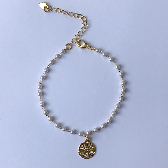 Pulseira 16cm com mini pérolas 2mm + pingente medalha de 1cm com oração pai nosso.
